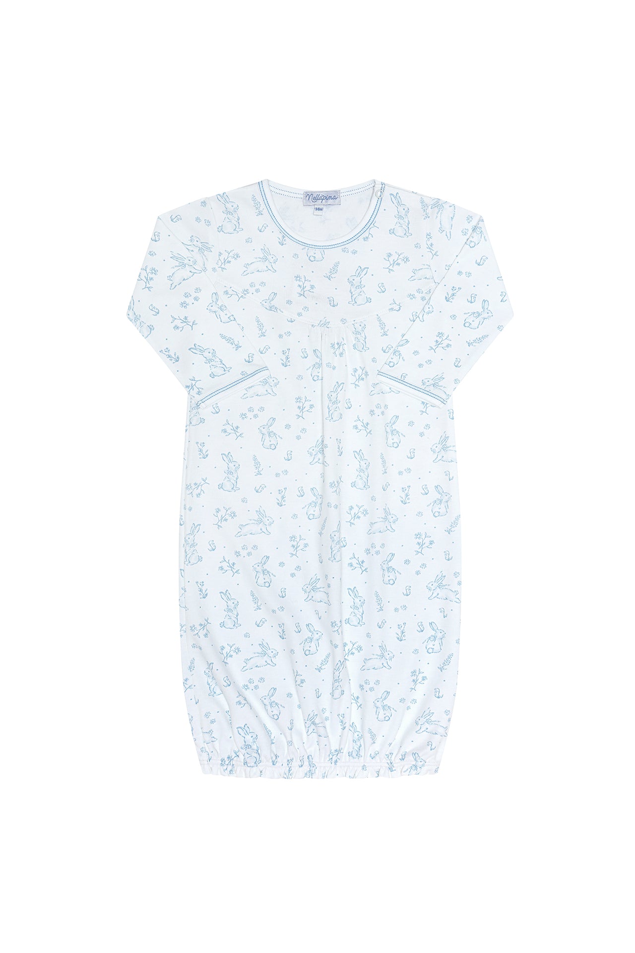 Keep your baby comfortable and cozy in our Blue Bunny Toile Gown. Made from 100% Peruvian Pima cotton, this soft and breathable gown is perfect for delicate newborn skin. Its charming toile print adds a touch of sophistication to this practical piece.