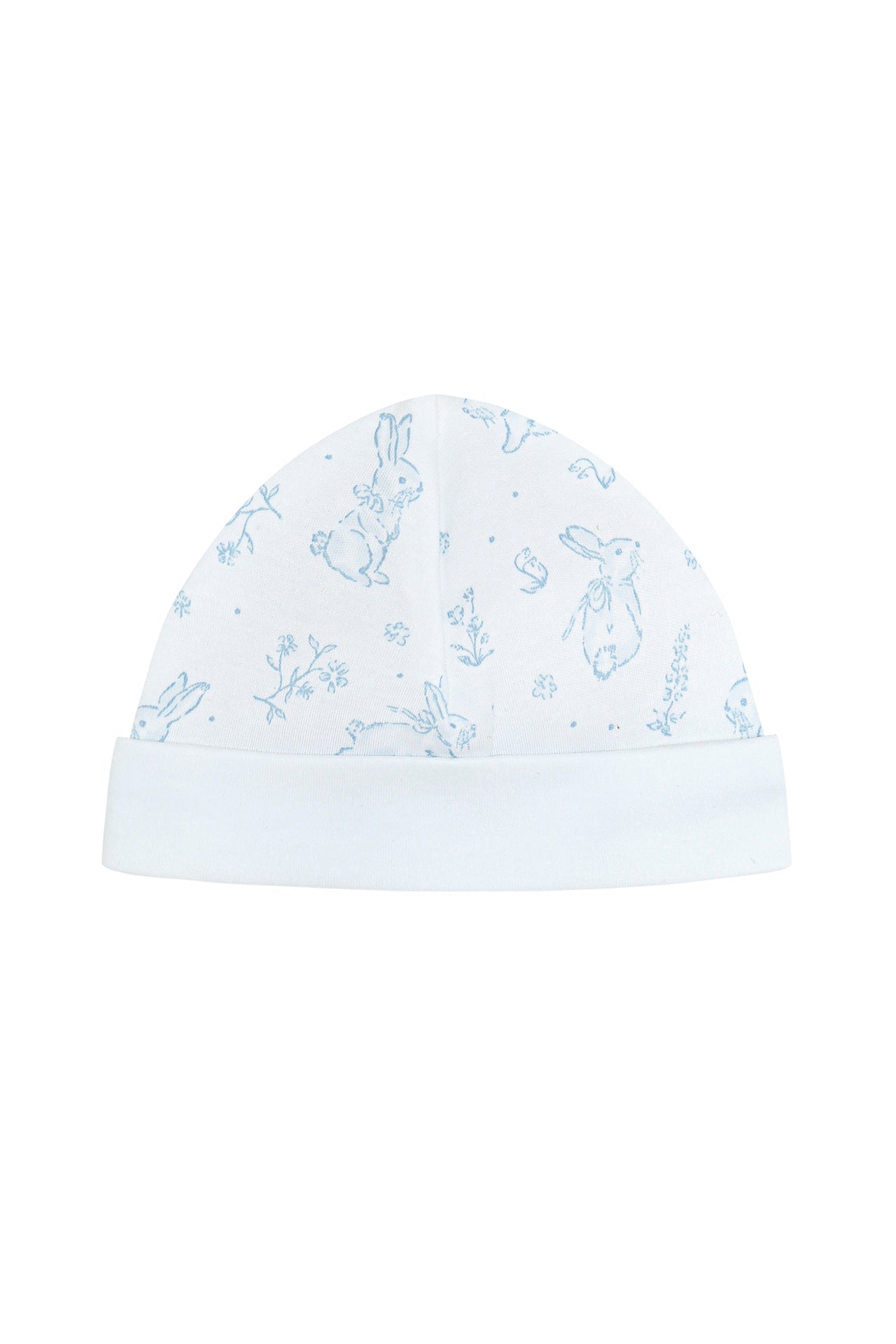 Complete your baby’s outfit with our Blue Bunny Toile Hat. Crafted from soft and breathable Peruvian Pima cotton, this adorable hat keeps your little one warm and comfortable while adding a charming touch with the bunny toile design.