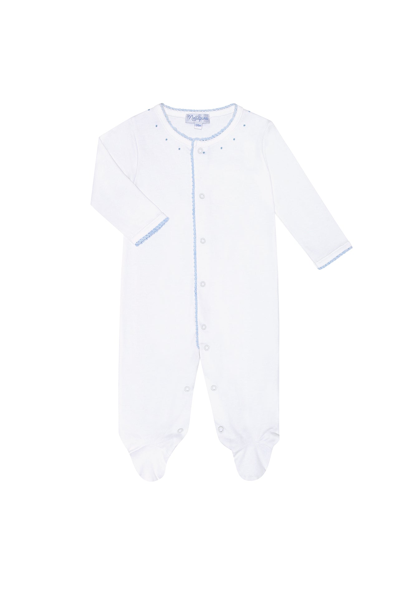 The Blue Crochet Footie, a must-have piece for your little one's wardrobe. Crafted from 100% pristine white Pima cotton, this footie offers unparalleled softness and durability, ensuring your baby's comfort all day long.
