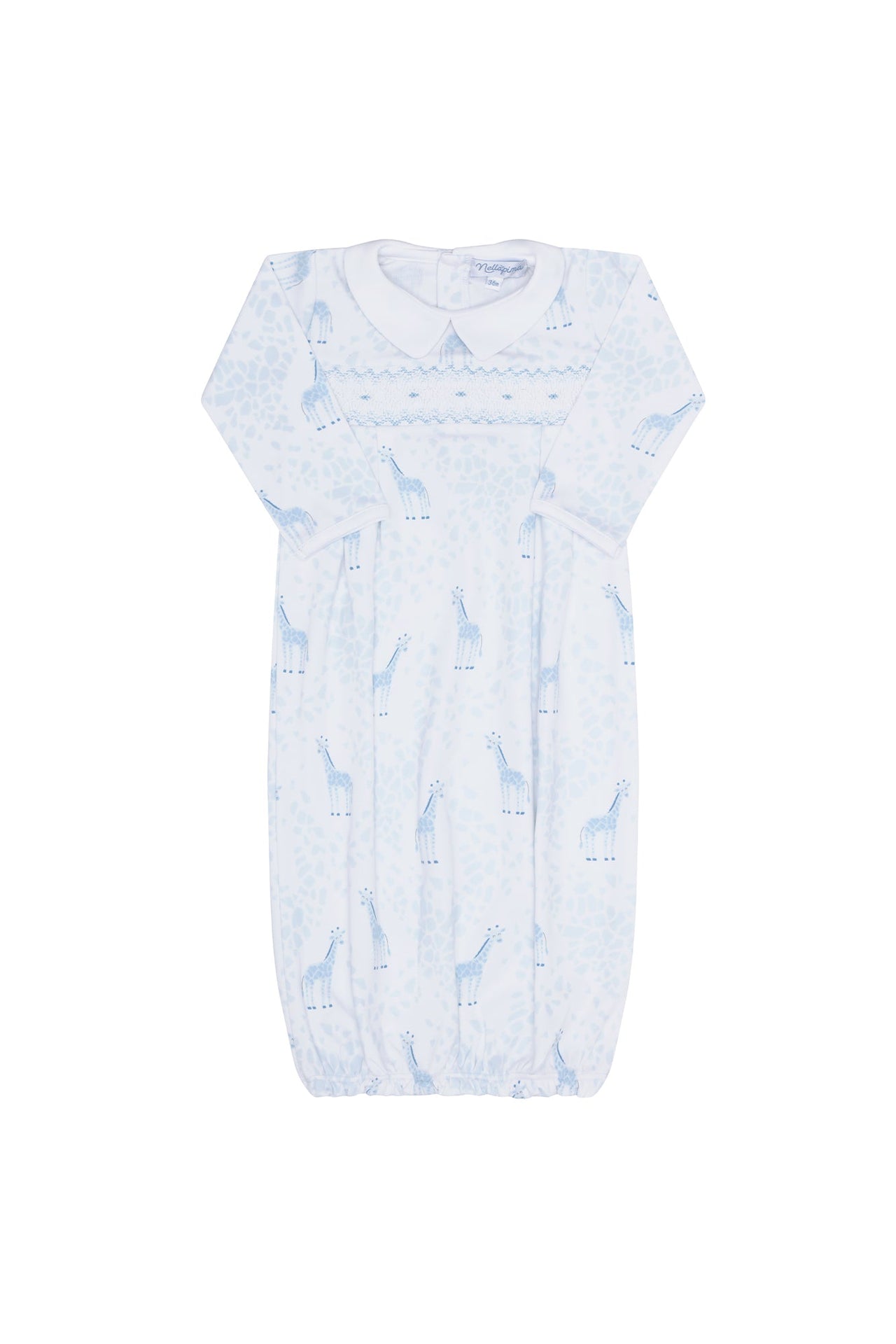 Introducing our enchanting Blue Giraffe Print Smocked Gown, a timeless blend of elegance and comfort designed to cradle your precious one in a world of softness. Available in sizes 0 to 6 months, this gown embodies the perfect harmony of style and practicality for your littlest bundle.