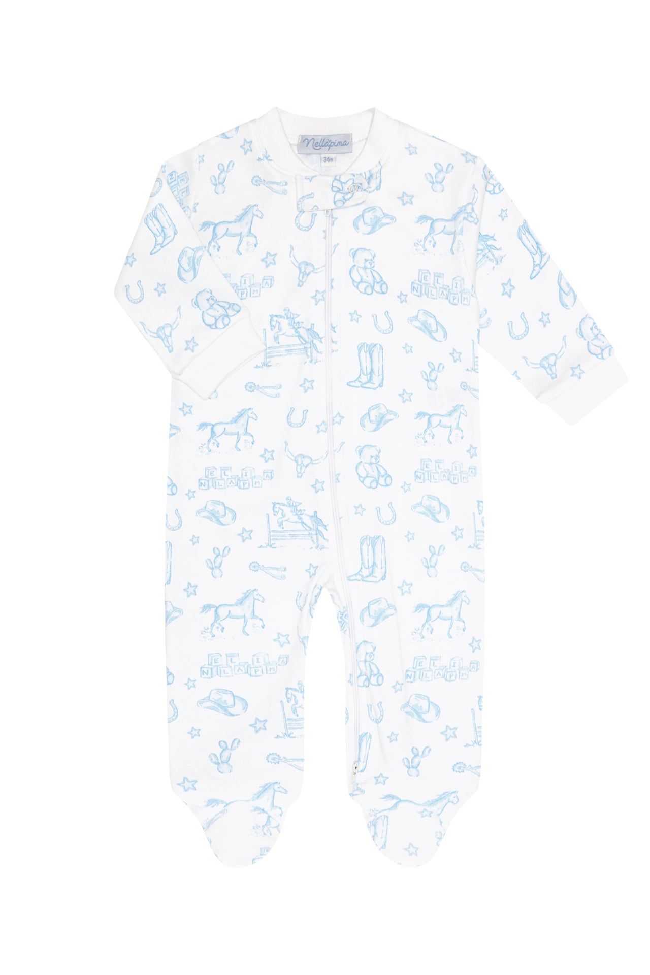 Wrap your baby in comfort and frontier flair with this 2-way zipper footie in our Blue Lone Star Toile print. Made from ultra-soft 100% Peruvian Pima cotton, it’s gentle on delicate skin and perfect for restful sleep or play. The 2-way zipperallows for quick changes from top or bottom, making diaper changes easier than ever. Enclosed feet keep your little one warm, while the soft Western-inspired print adds a touch of character to every moment.