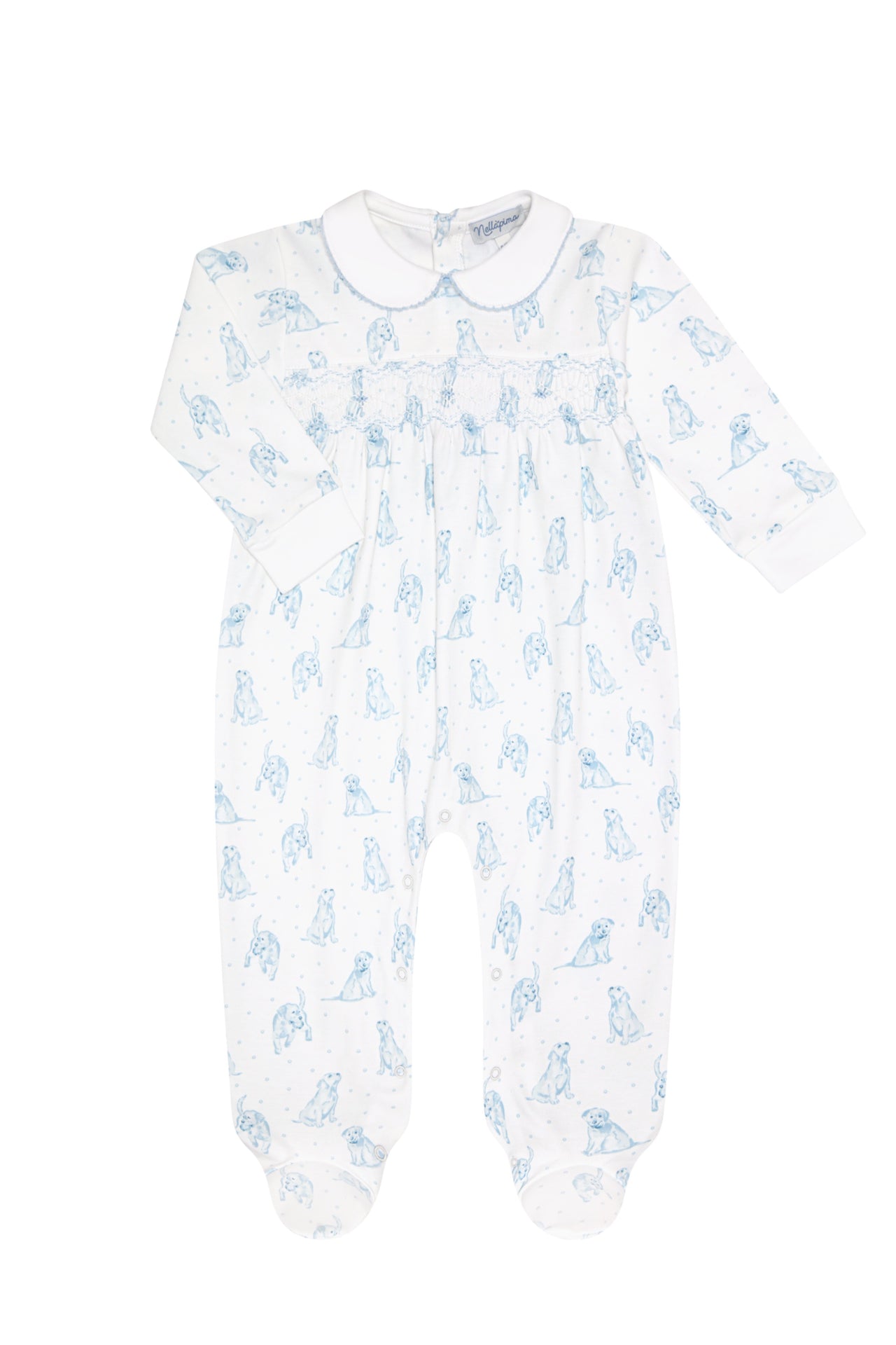 Hand-smocked with precision, this Pima cotton footie is both luxurious and functional. The delicate smocking on the chest complements the exclusive puppy print in soft blue tones. Snaps along the legs allow for quick changes, while the breathable cotton keeps your baby comfortable throughout the day. A keepsake-quality essential with timeless appeal.