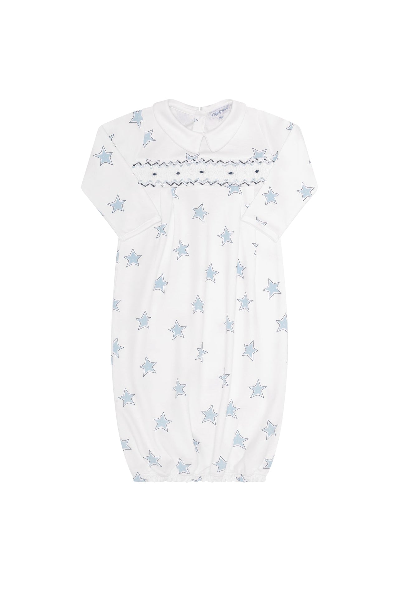 Is now available in three charming colors: gray, pink, and blue! This dreamy gown features a playful print of stars against a soft, soothing background, while the long sleeves and elasticized bottom ensure a snug and secure fit, perfect for a peaceful night's sleep or relaxed lounging at home.