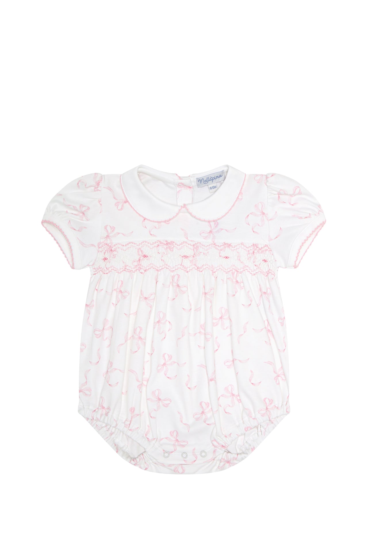 A timeless heirloom piece, this bubble features hand-smocked detail across the chest and a soft gathered silhouette. Made from 100% Pima cotton with our charming bow print, it’s ideal for photos, family events, or special occasions during baby's early milestones.