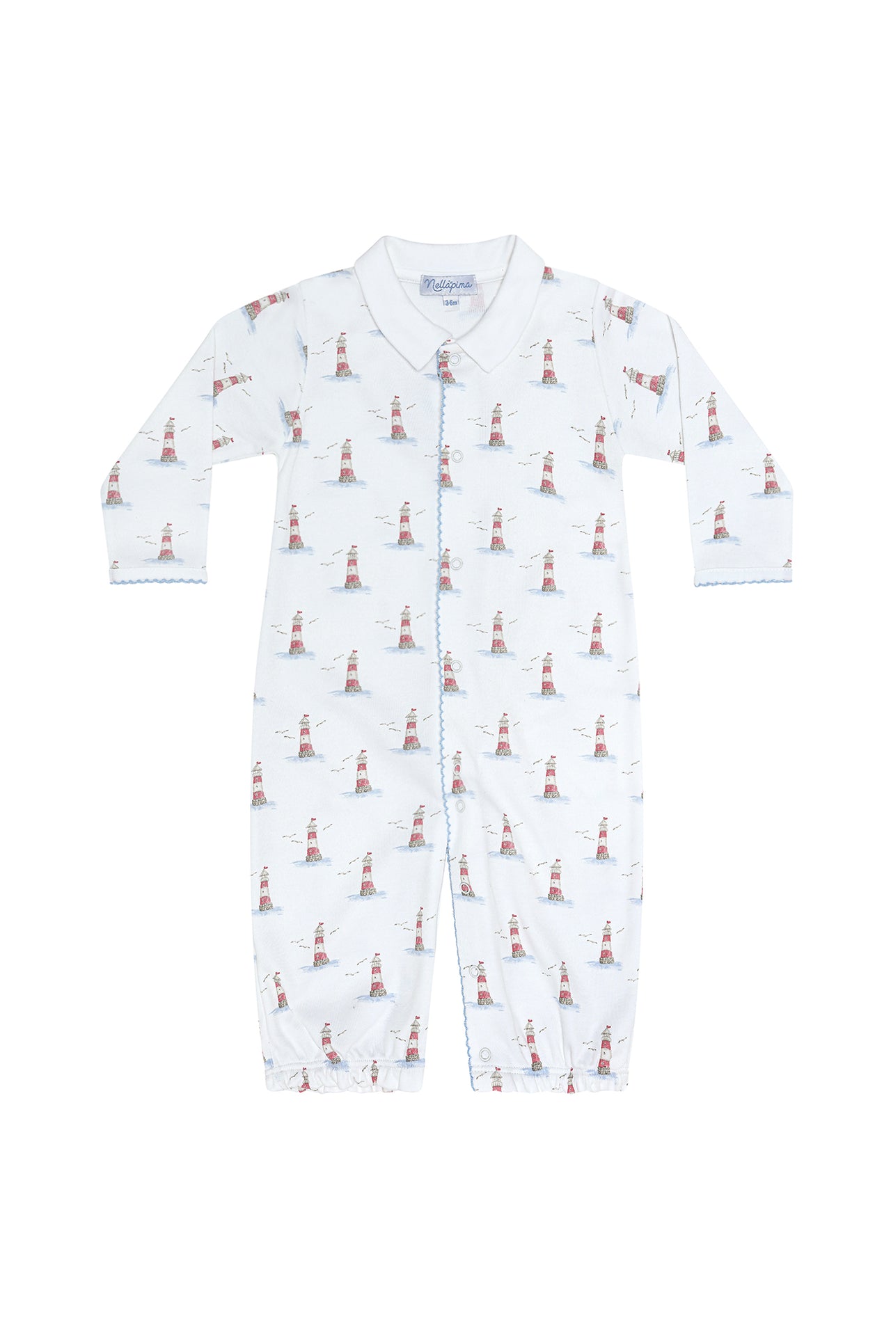 Versatile and practical, the Lighthouse Print Converter Gown is a must-have for your baby’s wardrobe. Made from 100% premium Peruvian Pima cotton, this gown features a charming lighthouse print and offers unmatched softness for delicate skin. Designed with a convertible style, it can be worn as a traditional gown for cozy naps or easily transformed into a romper for playtime or car seat use. Complete with snap closures for quick changes, this piece combines comfort, functionality, and timeless nautical charm.