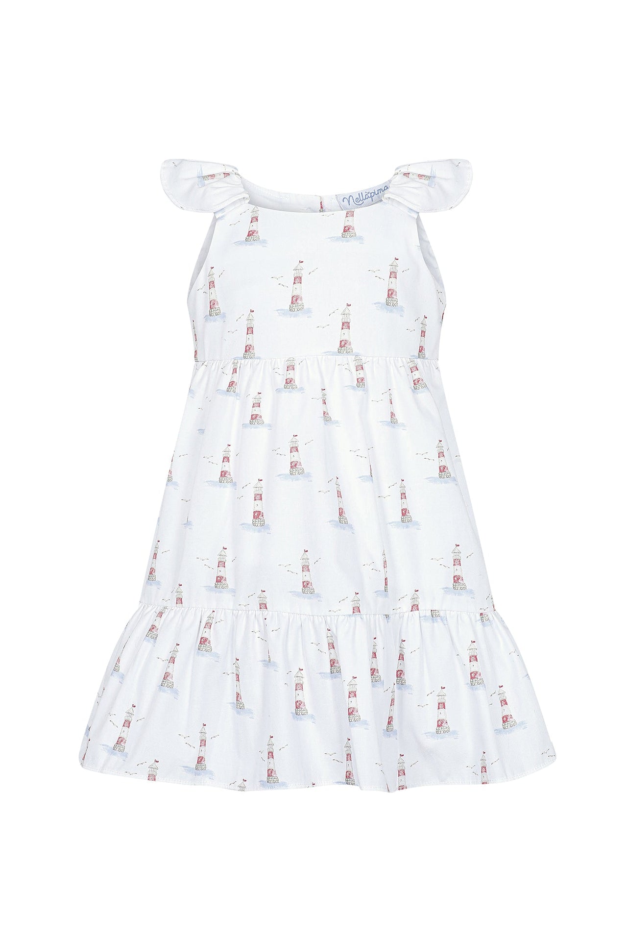 Elevate your little one’s wardrobe with the charming Lighthouse Woven Summer Dress. Made from 100% premium woven Pima cotton, this dress offers a more structured and polished look while maintaining the softness and comfort that Pima cotton is known for. Featuring the delightful lighthouse print, flutter sleeves, and a flowy ruffled hem, this dress is perfect for special occasions or adding timeless charm to everyday wear.