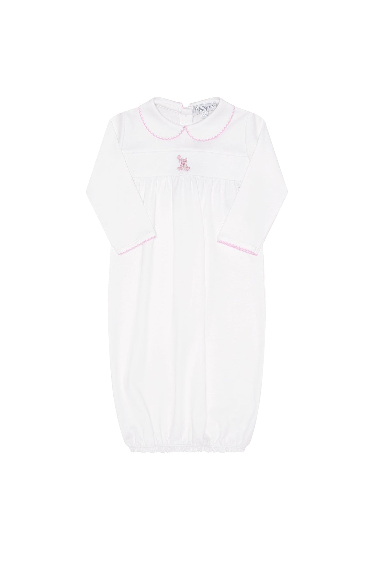 Introducing our delightful White Gown with Pink Bear Embroidery  – a bundle of cuddly charm designed to make your baby's early moments even more special. Crafted with love and attention to detail, this gown features an adorable pink bear embroidery and a touch of playful pink picot trim on the neck, creating a picture-perfect ensemble that's ready to captivate.