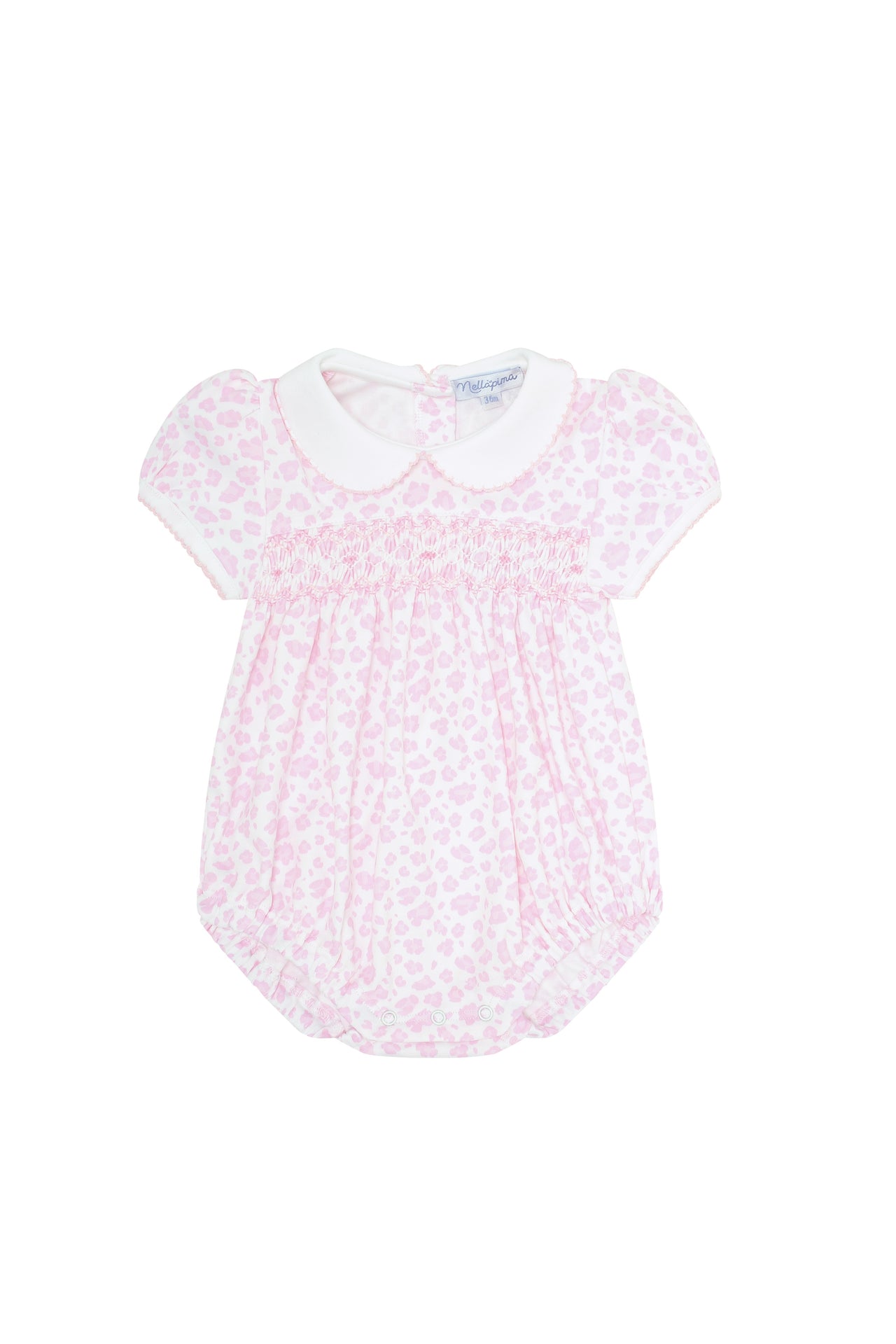 Elevate your baby's wardrobe with our classic pink cheetah print bubble, a timeless piece crafted from stylish and durable fabric. This charming bubble Features an intricate handmade smock detailing on the chest, and a crisp white collar, adding a touch of elegance to the playful cheetah print.
