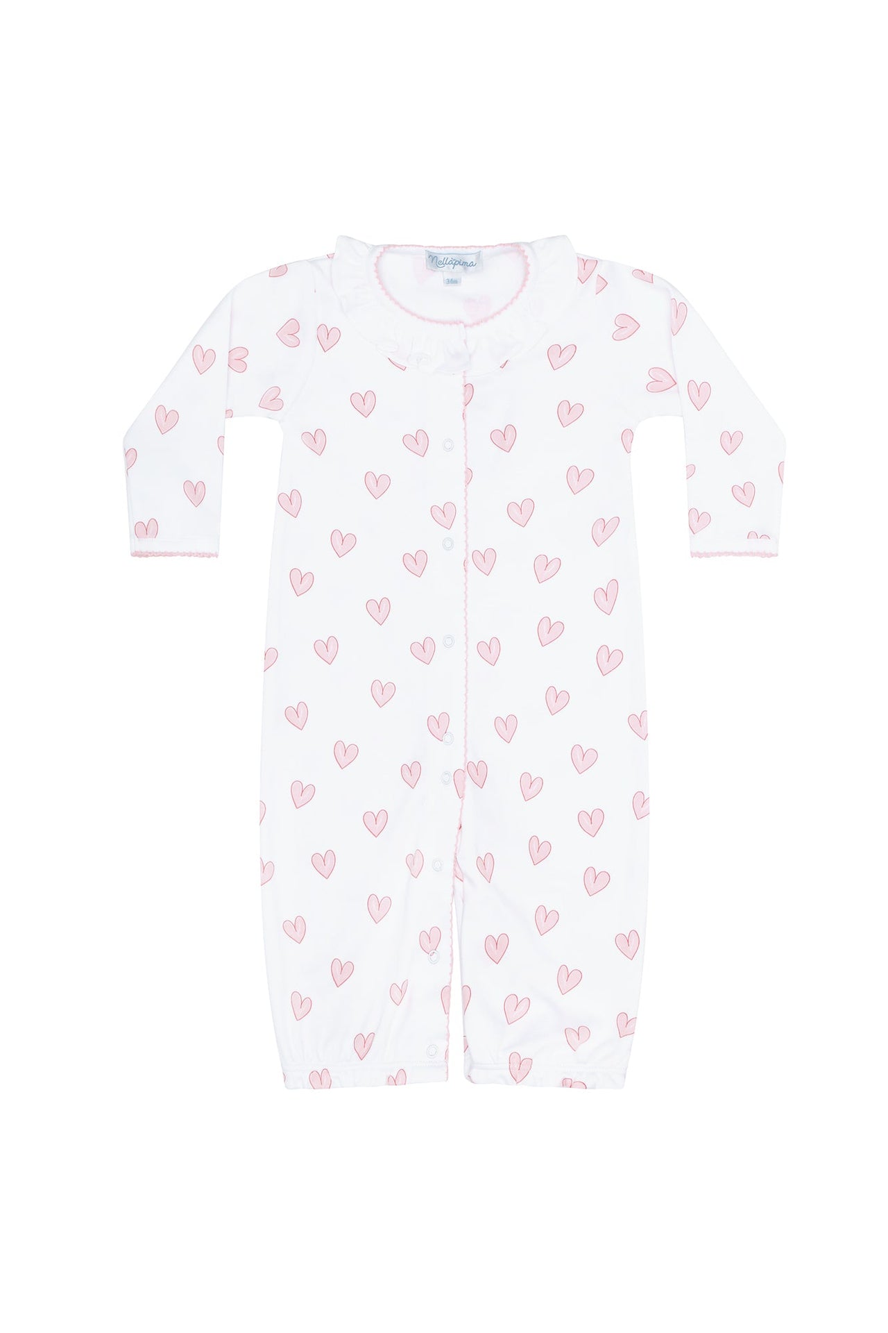 Our Pink Heart Print Converter Gown features a picot trim detail around the collar, cuff and down the snap-close front in a classic pastel pink color, and is printed all over with heart shaped designs. Made of 100% Pima cotton, this gown is stretchy and feels soft on your baby's skin.