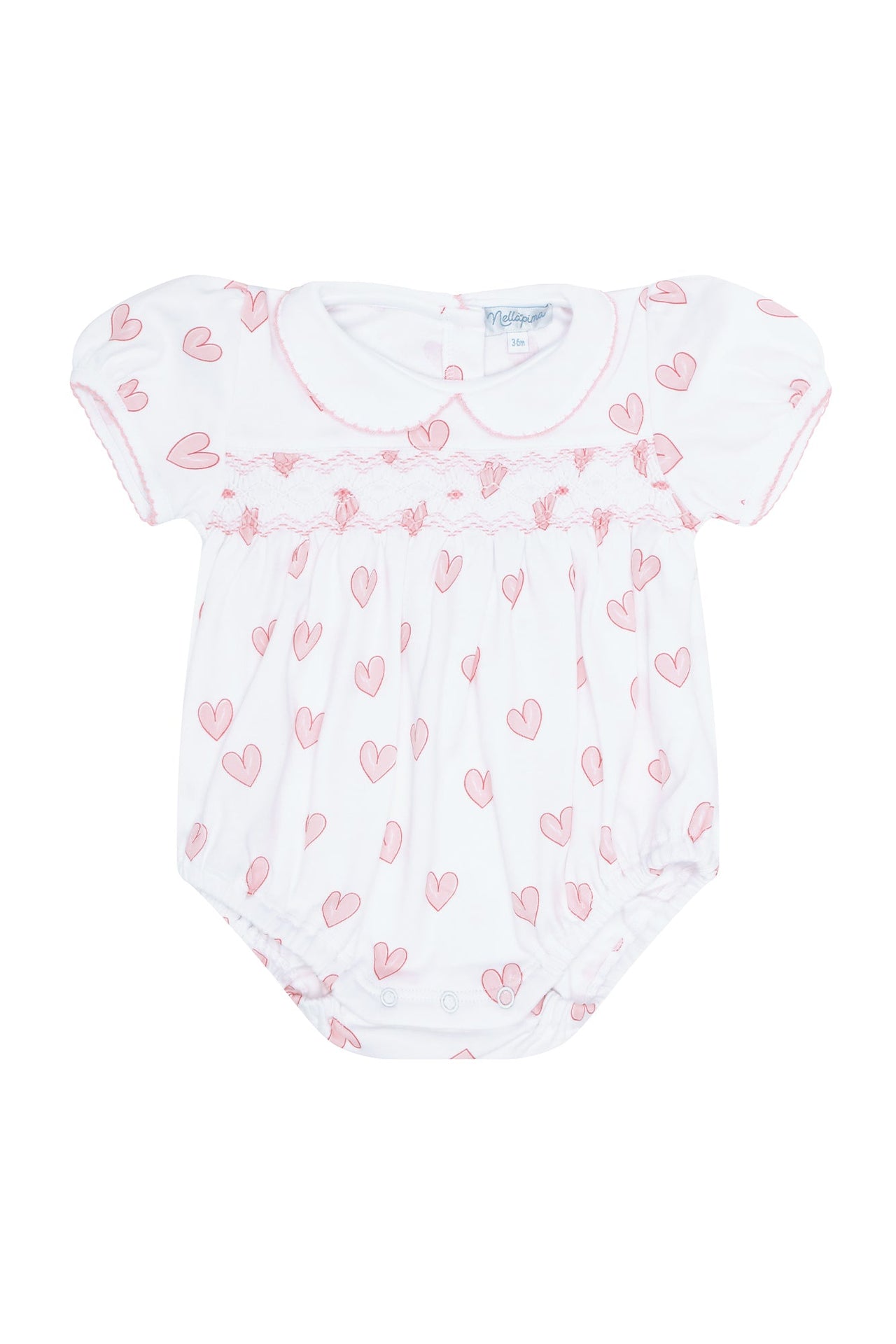 Our 100% Pima Cotton Pink Heart Print Smocked Bubble is designed to bring a touch of sweetness, charm, and friendliness to your baby's wardrobe. Available in sizes ranging from 0 to 18 months, this smocked bubble is crafted with love and care to ensure utmost comfort and irresistible style.