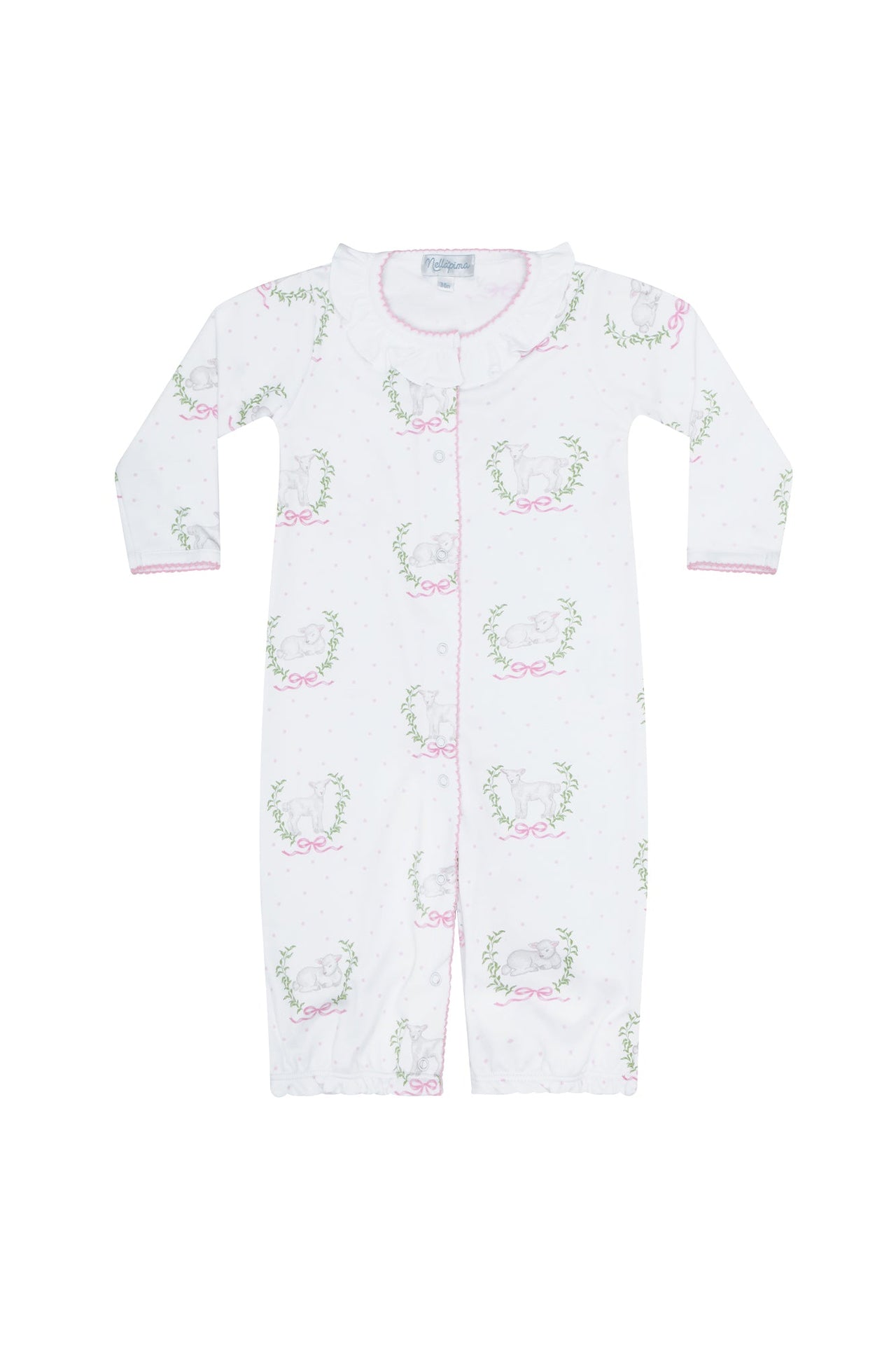 Pink Lamb Baby Converter Gown features a picot trim detail around collar and hand, classic pastel pink color, and imprinted with lamb shaped design. Made of 100% Pima cotton, this gown is stretchy and feels soft on your baby's skin.