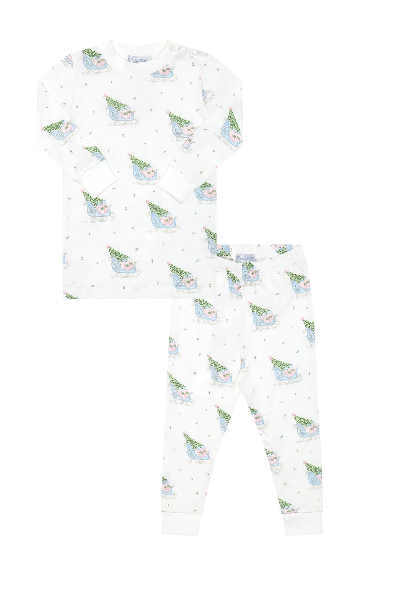 Our Merry Sleighs Two-Piece Pajamas in pink sleighs are part of the Everyday line, crafted from our ultra-luxurious Pima cotton in our finest lightweight weave. Soft, breathable, and gentle on delicate skin, they’re perfect for cozy nights, festive mornings, and everyday comfort throughout the season.