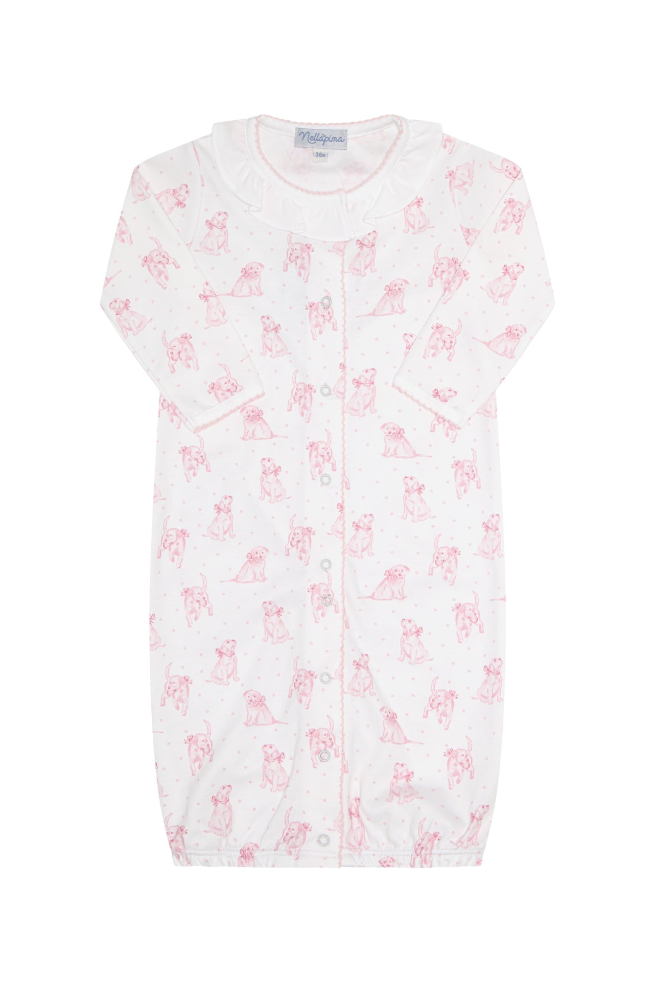 With the versatility to convert from gown to romper, this piece is both practical and beautifully designed. Crafted from ultra-soft Pima cotton and featuring sweet pink puppy prints, it transitions effortlessly through nap time and playtime. Snaps along the bottom allow for easy changing. Delicate picot trim adds a refined finish.