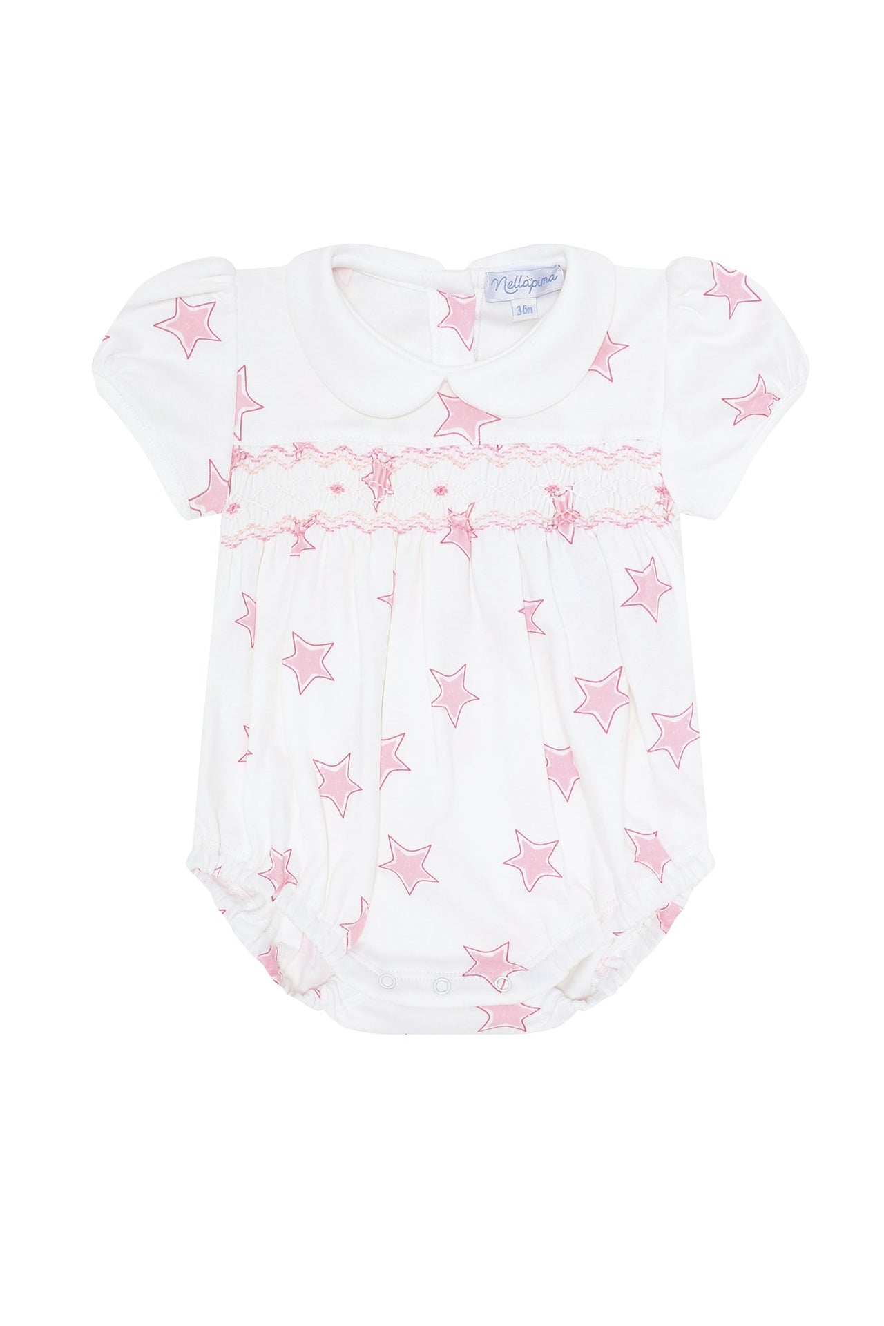 Our 100% Pima Cotton Stars Print Smocked Bubble is designed to bring a touch of sweetness, charm, and friendliness to your baby's wardrobe