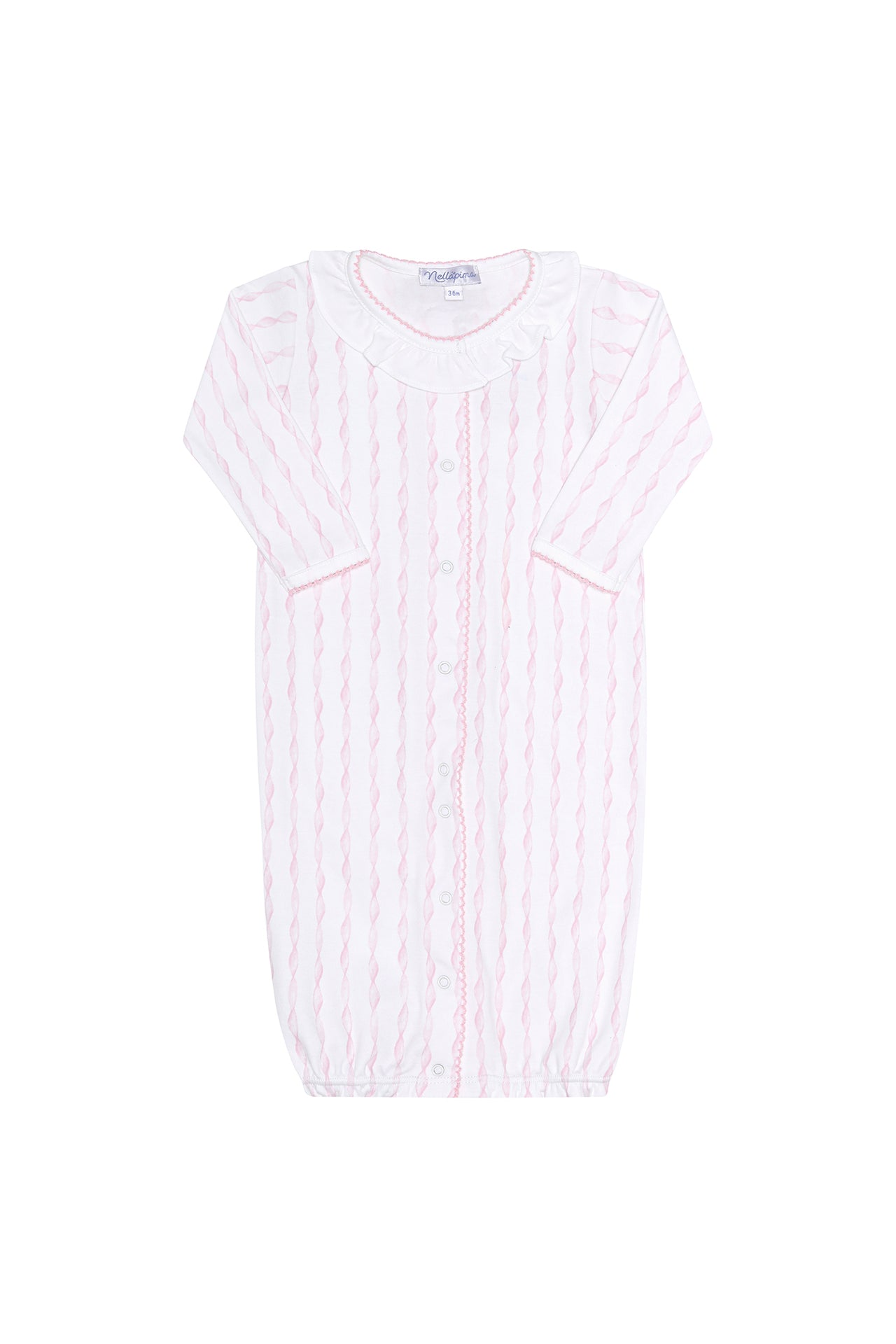 100% Pima cotton for ultimate softness Delicate pink twirl pattern Pristine white collar Elegant pink trim on hands and button area Converts from gown to romper for versatile use Easy snap closures for quick diaper changes Perfect for day and night wear
