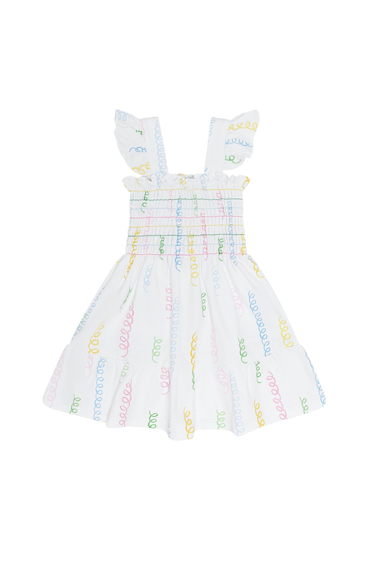 This delightful Spirals Print Gathered Dress is made from luxurious 100% Pima cotton, ensuring unmatched softness and breathability for your little one. Featuring a vibrant multicolor spiral print, this dress is perfect for brightening up any day. The smocked bodice offers a comfortable and flexible fit, while the ruffled straps add a playful, elegant touch. Designed with a gathered skirt for effortless movement, this lightweight dress is ideal for warm weather or special occasions.