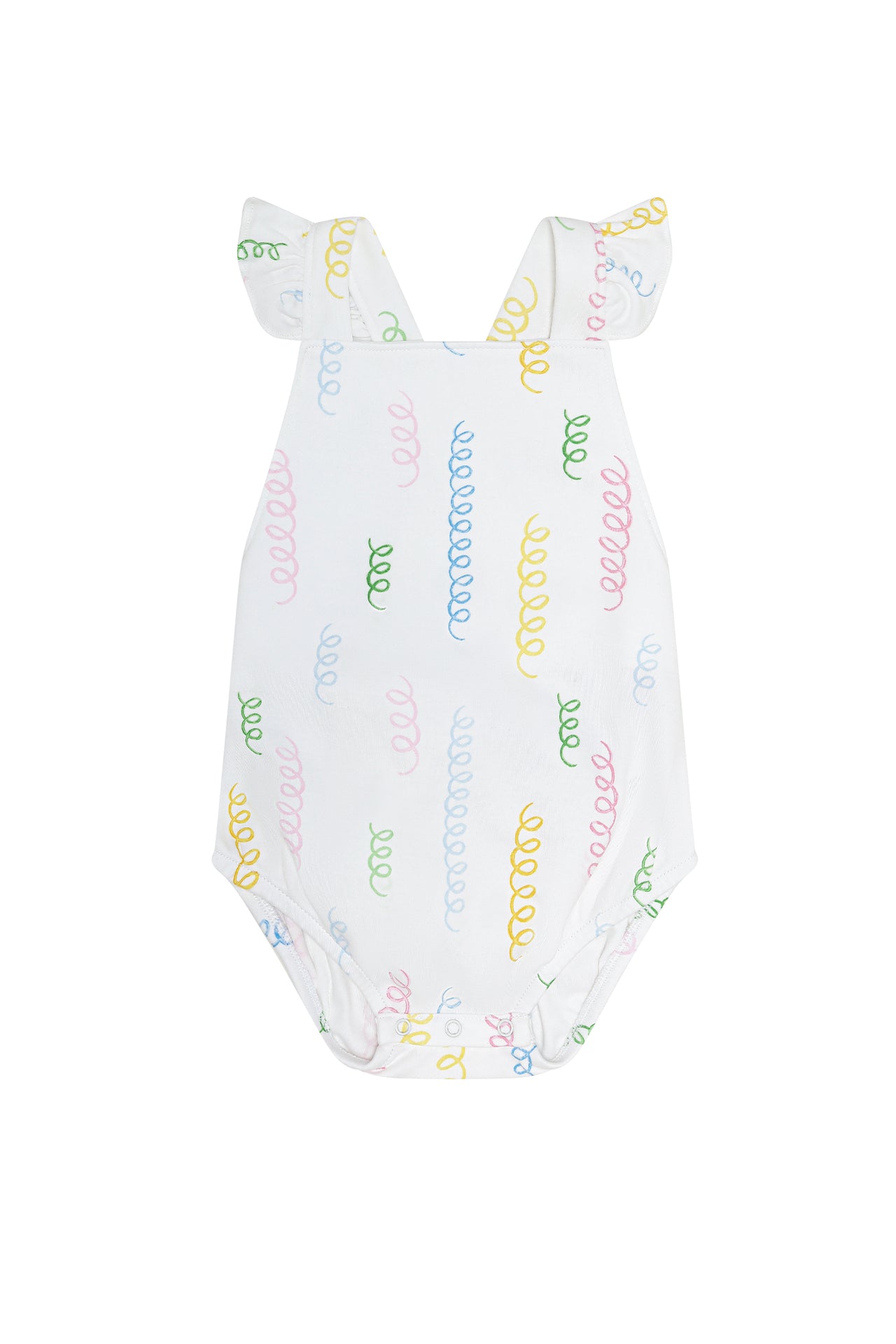 Perfect for warm weather outings, this Ruffle Bubble features a cross-back design and delicate ruffle details, enhanced by the vibrant Spirals print. Made with 100% Pima cotton, it’s lightweight, breathable, and gentle on sensitive skin.