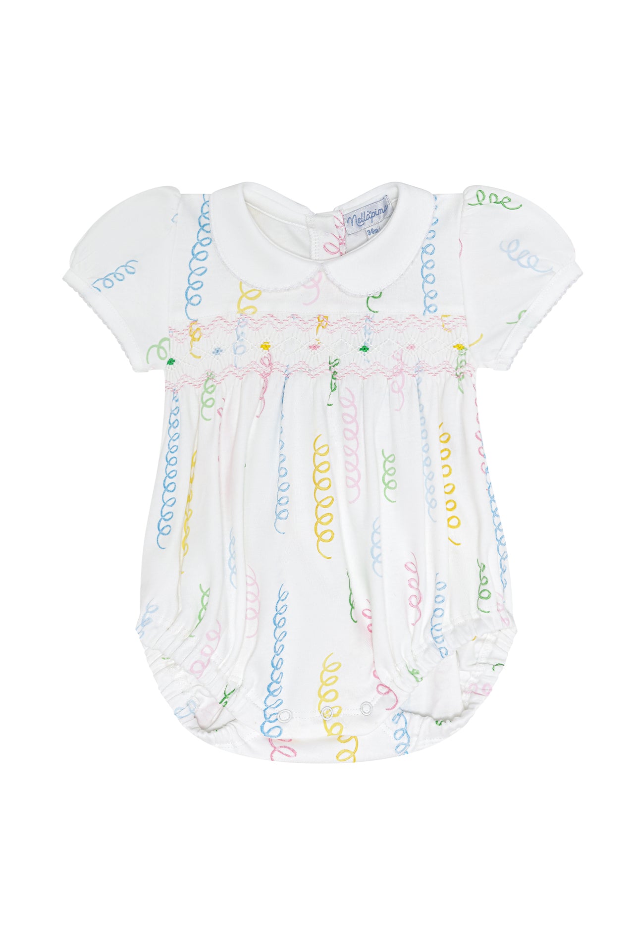 Delight in timeless charm with this Smocked Bubble, showcasing handmade smocking and the cheerful Spirals print. Made from 100% Pima cotton, it’s as soft as it is stunning.